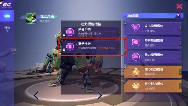 移动模组方面,建议选择离子推进并将其升级到五级开放状态。这是厄运光束极为关键的模组,能有效提升火箭推进的速度。由于厄运光束自身速度本就偏低,一旦遭遇机动性强的机甲,很容易沦为活靶子,所以在战斗中存活到最后才是核心目标。