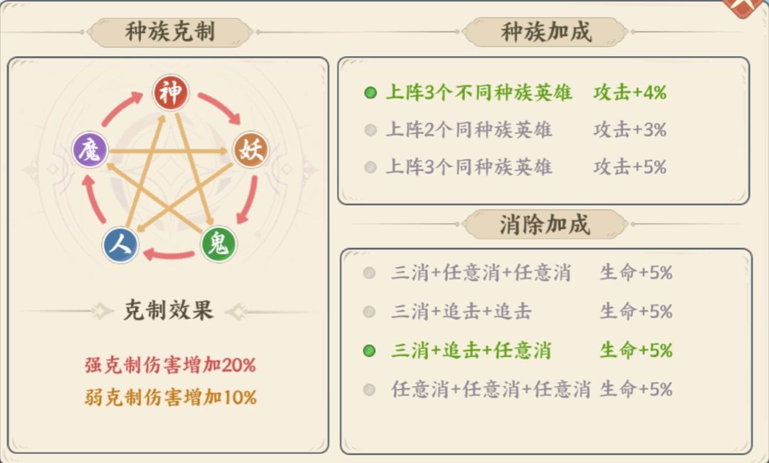 在战斗界面、阵容调整界面以及英雄详情界面等场景下,我们能够看到英雄具备不同的消除类型。