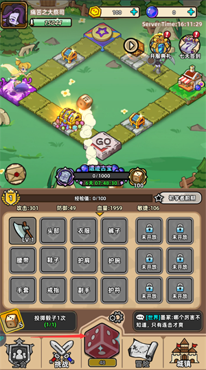 1、点击骰子骰出点数,角色移动到格子上有可能爆出装备