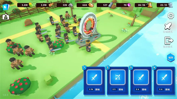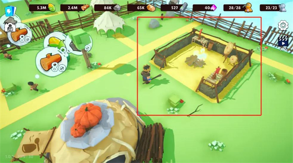 3、开局正常开局,随便撸点资源,把房子搞起来。然后,一边招募农民一边提升粮食速度。杀杀猪,直到把粮食顶满。你会发现这个时候你最开始刨一下只有一个粮食,但是后面刨一下就会得很多很多。然后然后把该升级开的东西都开一遍。当你需要一个紫钻的时候。去右下角的地图有个传送门在那里打试炼。随便打点紫钻。把那个离线收益的科技点出来。这个非常关键。