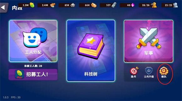 2、打开科技面板,同样右下角也会出现编队按钮。进入编队界面,在上方三个带有武器的框框中,选择自己想要调整的编队框,并点击下方的士兵即可将士兵添加至选择的编队框中,一共可以建造四个方队。