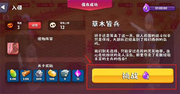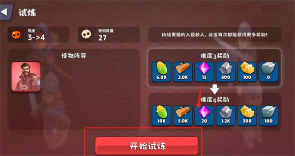 2、点击入侵之后,可以看到左上角有一个试炼按钮。点击试炼,会升级难度,增加敌人数量及战力。但是后续可以获取更多的紫宝石哦。