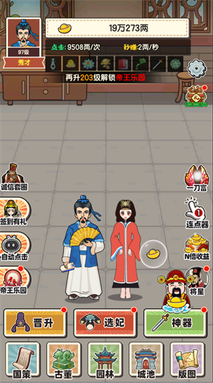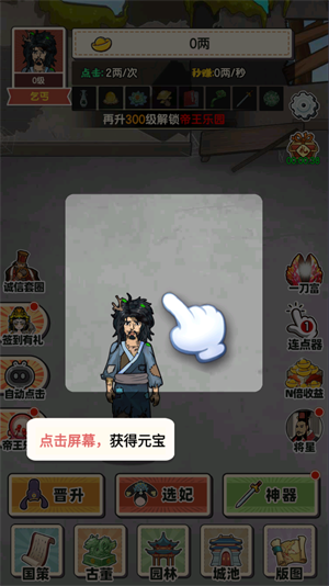 1、通过点击屏幕,玩家可以不断的获得元宝