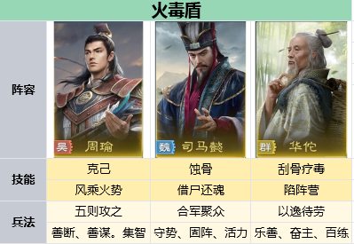 火毒盾:周瑜、司马懿、华佗(满红白板皆可用)