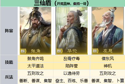三仙盾:华佗、左慈、张角(低红高红都好用)