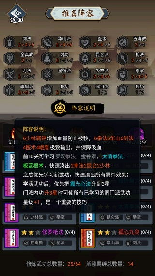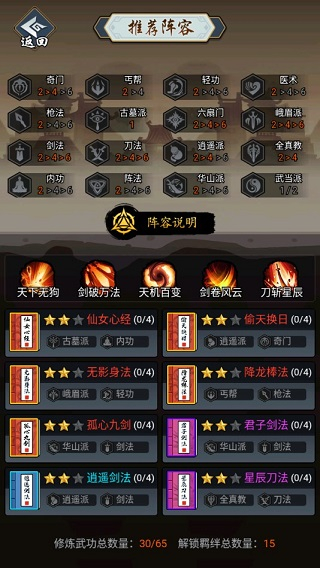 每一种武功都有门派和职业属性,凑齐一定数量相同门派或职业的武功可以激活相应羁绊,大幅提升战力,一定要注意武功阵容搭配,激活强力的羁绊组合。