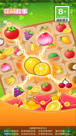 在花间故事中,玩家只要轻轻动动手指,把相同的水果连再一次,就可以把他们消除了,并且只要累积到一定的分数,玩家就可以领取一个红包,红包虽小,但胜在累积至0.3就可提,新人也可以通过看广告的方式来获取红包