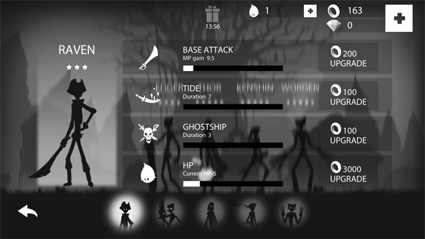 1、进入游戏后会出现五位不同的火柴人,其中第一位是初始火柴人,其余四位需要用金币和钻石解锁。