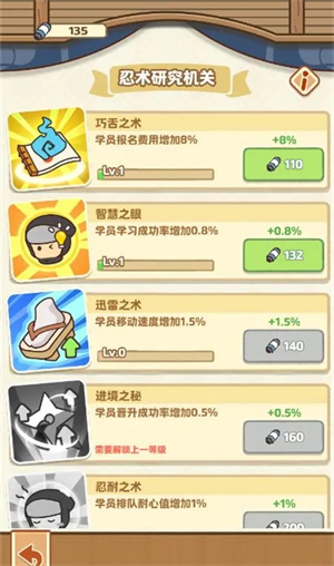 2、解锁忍术后,可以先积攒学识,优先把全部忍术都解锁,全部解锁1级之后再根据自身当前的需求进行单一忍术的升级。建议是优先把繁盛之术这类直接增加学院收益的忍术先升级,整体的铜币获取提升会更大一些