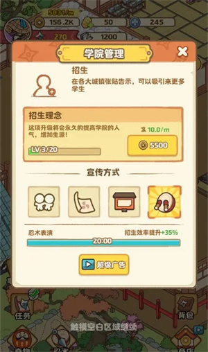 4、在完成任务升级招生理念的同时,可以选择开启招生(共有4种不同的招生方式,分别为消耗铜币、判金和观看广告),收益最高的自然就是观看广告,不仅招生效率+35%,而且持续20分钟,期间获取铜币的提升会非常高,建议优先选择该方式开启。