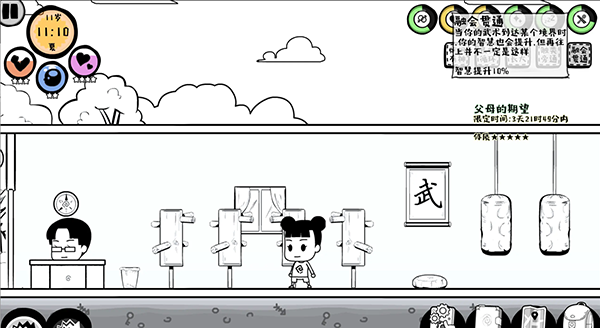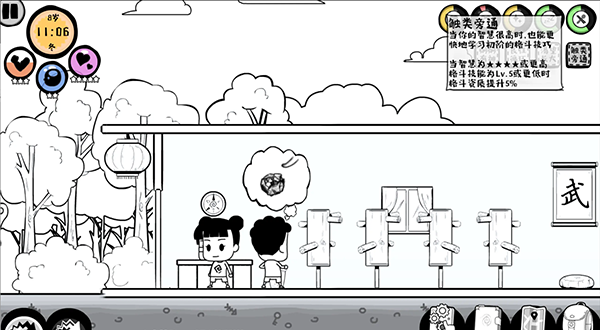 4、第四个增益效果是“良性循环”,当拥有足够资金前往武馆且格斗资质未达到满星时,该效果必定触发——毕竟此时还未学习任何技能。其作用为使格斗资质提升5%。