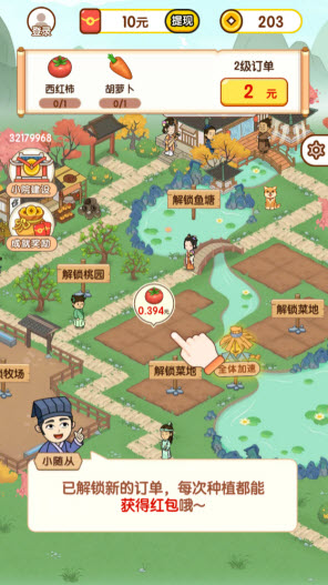 2、随着游戏进度的提升,你可以在后面解锁新的田地,这样种植的面积就能不断的扩大。