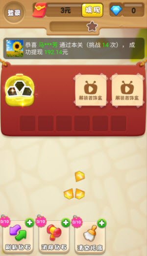 不同颜色的钻石需集齐三个相同颜色的才能消除,每次消除都会得到红包奖励,积累到一定数量就能进行提现操作。