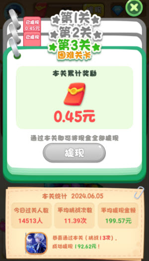 3、完成指定关卡后,可将当前获得的所有红包按比例进行提现