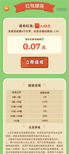 游戏的兑换比例初始设定为百分之一,后续可通过完成订单来提升这一比例,如此一来,到账的红包金额也会相应增加。