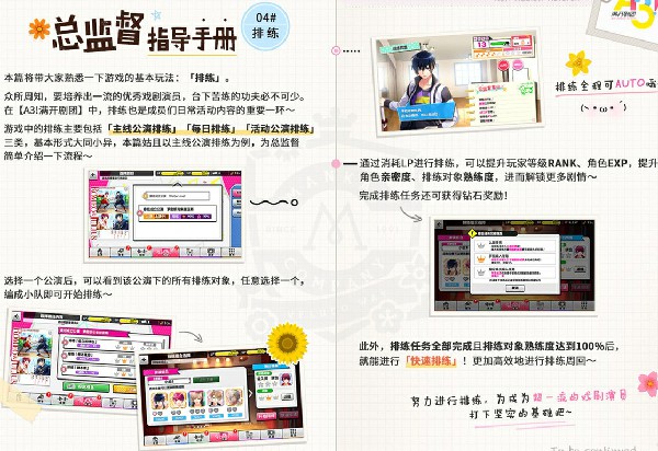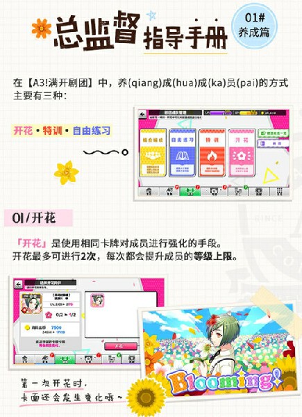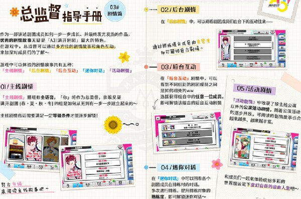 A3!满开剧团是一款面向女性玩家的偶像团体养成游戏,在游戏里,你将同时担任总监制与经纪人的角色。你的核心任务是召集一群风格各异的帅气成员,帮助这个濒临解散的剧团重获新生。你需要发掘并组建代表春、夏、秋、冬四季风格的男生团体,而如何说服他们加入、悉心培养他们成长,以及在过程中给予鼓励,都由你全权负责。游戏全程配备专业配音演员的精彩演绎,代入感十足!现在就来A3!满开剧团开启这段养成之旅吧!
