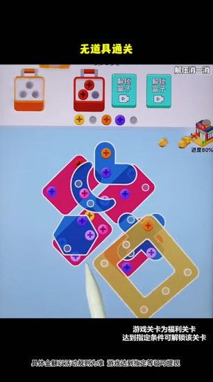 螺丝消除小游戏,关卡多且操作简单,红包按照百分比来提现,看广告也能得到红包,值得体验。