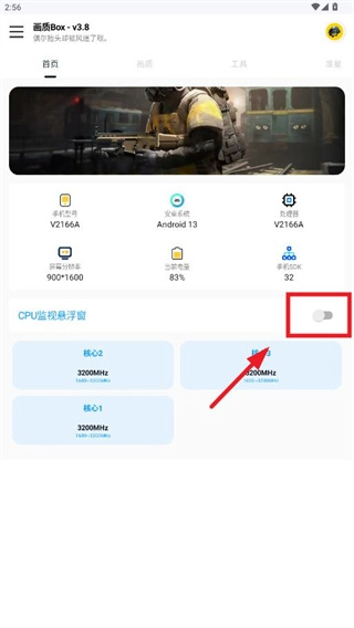 进入首页后,能够查看手机的型号、系统、处理器、分辨率、电量等信息,同时还可以点击开启CPU监视悬浮窗功能。