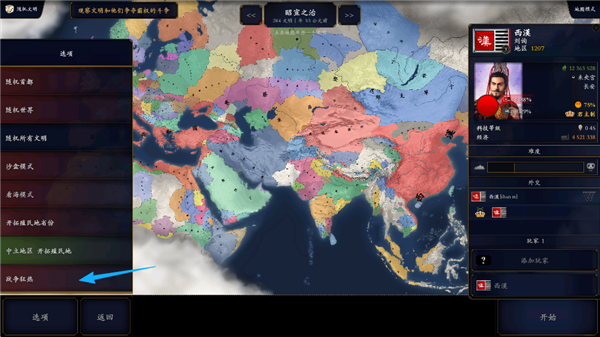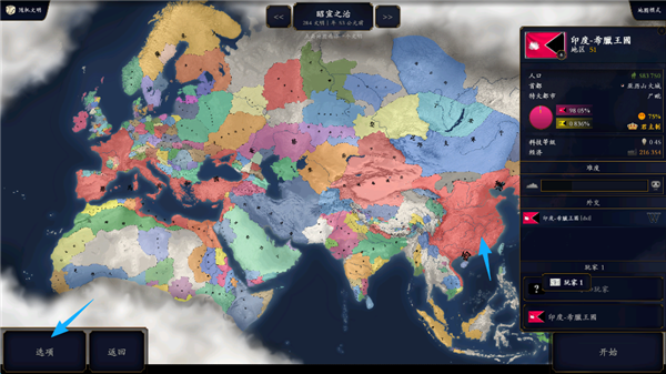 选择后,系统会随机分配一个国家供玩家操控;若想自主选定游玩国家,可直接点击地图上对应国家的疆域,接着打开左下角的“选项”按钮。