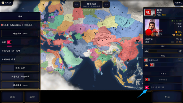 可以看到,这里原本标注的是“印度-希腊王国”,不过在地图上先点击该国家,接着再次点击这个位置,此处的标注就会变成“西汉”了。(具体可参见步骤7的图示)