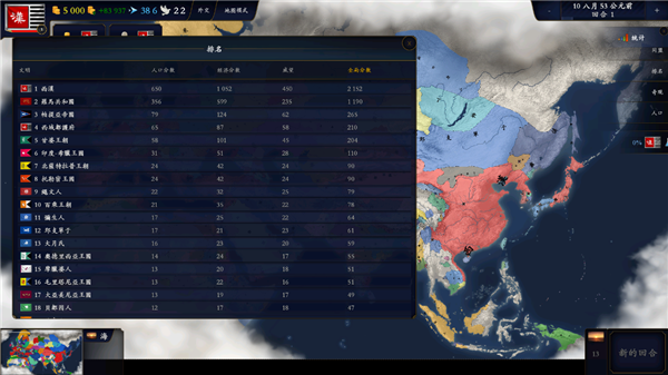 开局建议先查看世界排行榜,留意哪些国家是惹不起的。原来我们扮演的是“西汉”,那完全不用担心了——东渡小岛、西征罗马,对我们来说都是轻而易举的事。或许是游戏的“特色机制”,文明时代系列游戏都能通过“交易请求”功能,让国家A无限制地向国家B宣战。要是自己抵挡不住大国的进攻,就能用这个办法让多个国家联手对其宣战。经过在本游戏中的实际测试,这个方法依然管用。