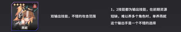 燕妮具备两个输出技能,攻击范围也相当不错,就算资源不够,也能得到良好的培养。