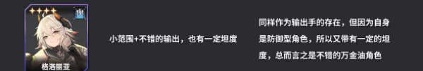 格洛丽亚拥有出色的攻击范围与输出能力,同时具备一定的抗伤害能力,是能适配多种场景的万金油角色。