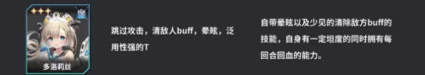 多洛莉丝是一名泛用性很强的前排角色,她能够跳过敌人的行动,清除敌方增益效果,并且拥有晕眩技能。