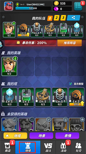 3、进入炮塔界面,玩家在这里可以搭配自己的阵容,了解自己的英雄,升级自己的塔以及管理场景和表情。