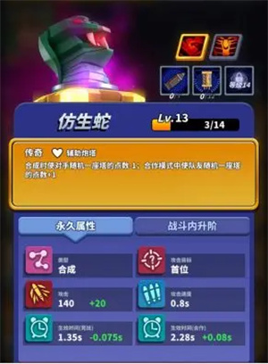 4、仿生蛇:合作模式中队友不可缺少的必需品,竞技模式中对手不可忽视的危险品,觉醒技能 以后还可以在不同模式中一次±2 对手(队友)的防御塔点数,属于核心塔之一