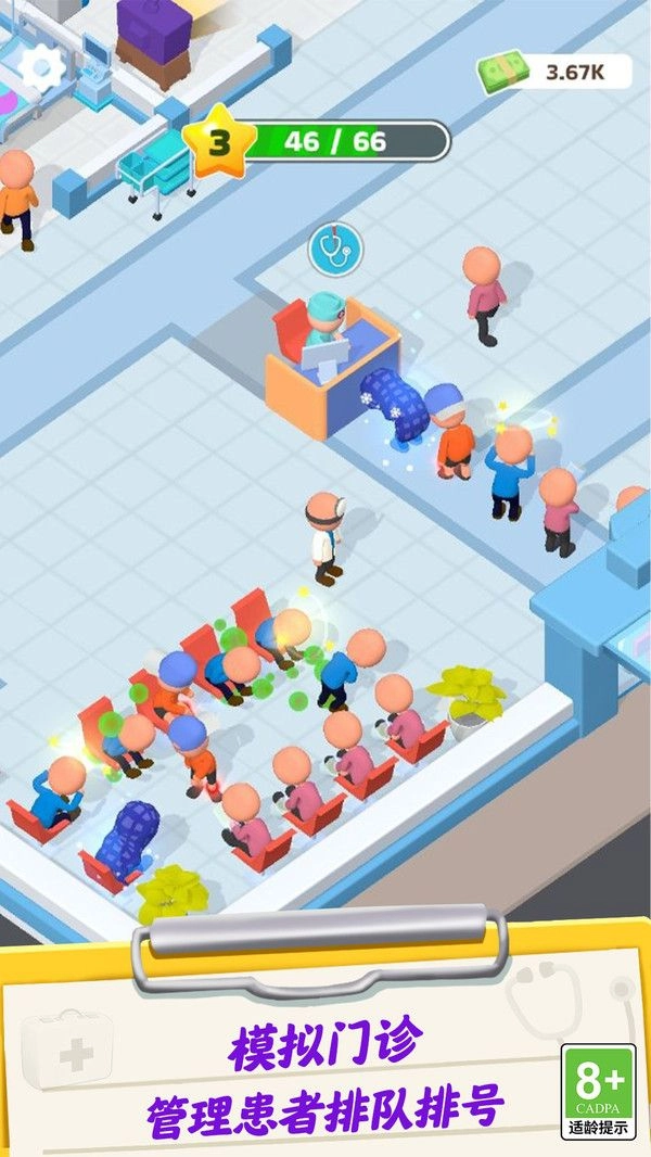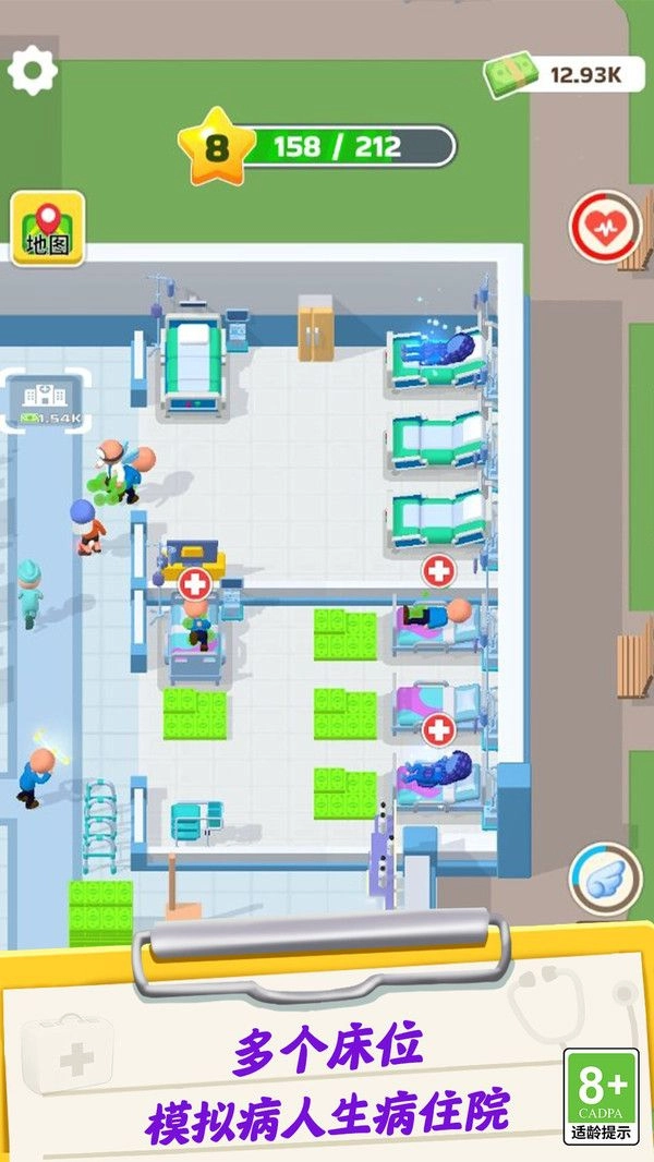 科室的建设与升级:利用金币解锁手术室、药房等核心设施,借助升级床位和诊室来提高接诊能力。