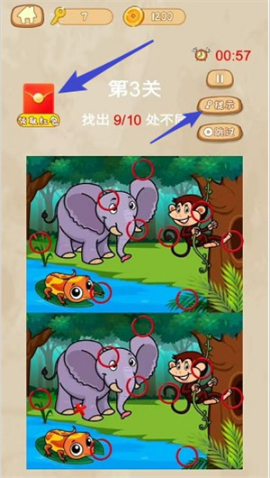 找茬记的核心玩法是找出两张图片间的差异。每发现一处不同,玩家就能获得一个红包,这种即时反馈让游戏充满成就感。尽管关卡设置带有一定难度,但系统提供了提示功能,能在玩家陷入困境时给予帮助。此外,界面左上角设有计时红包奖励,意味着只要参与游戏,就有机会领取红包。