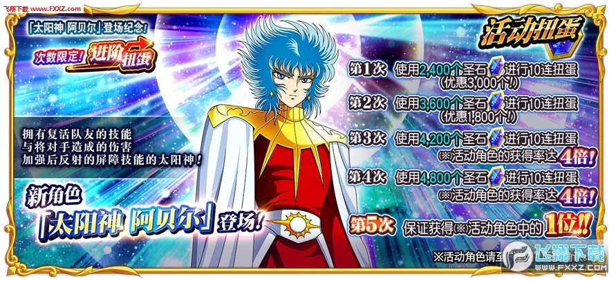 2019年4月16日,游戏迎来全新角色,「太阳神 阿贝尔登场纪念」次数限定进阶扭蛋活动限时开启!