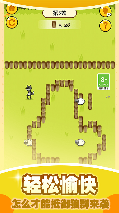 -凶恶的大灰狼闯入了这片牧场,用木桩把小羊们围了起来,快击退大灰狼的坏主意吧!