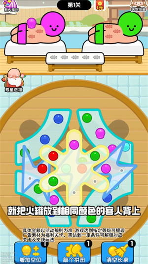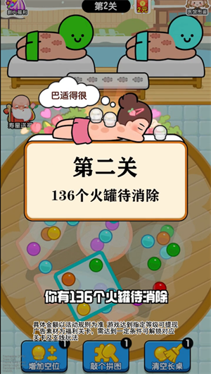 1、拔罐消除玩法:玩家需依据客人头发的颜色,点击对应颜色的罐子来完成拔罐操作,该玩法对反应速度和策略思维均有考验。