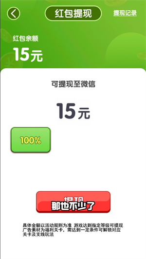 3、快速提现:红包金额累积满0.3元即可发起提现,且到账速度快,能够满足玩家即时获取回报的需求。