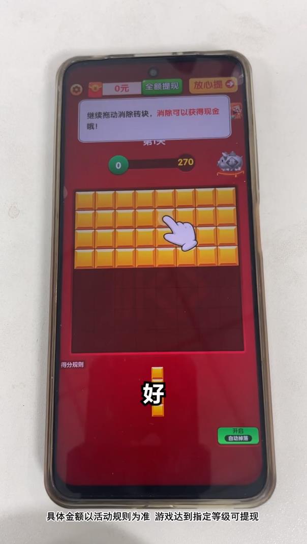 这款游戏支持提现功能,玩家通过合成方块就能获取红包奖励,当拼好任意一行或一列并完成消除后即可通关。新手玩家通常只需通过一两关就能直接发起提现,游戏内的红包提现采用百分比机制,通过的关卡数量越多,对应的提现比例就会越高。