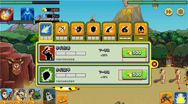 5、除此之外,点击右下角此处,还可以花费金币,升级士兵们的各项属性,以便能够更高的击溃敌方。