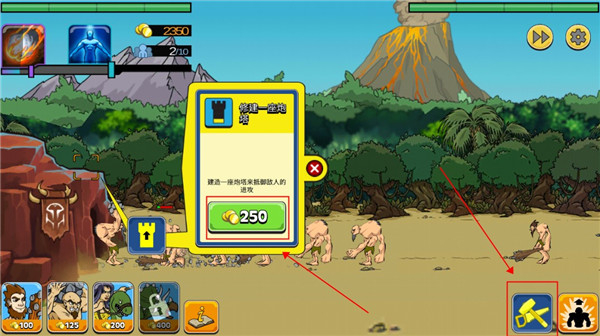 4、除了召唤士兵守卫基地外,我们还可以点击右下角的建造,为基地建造防御用的爬塔等防御设施。