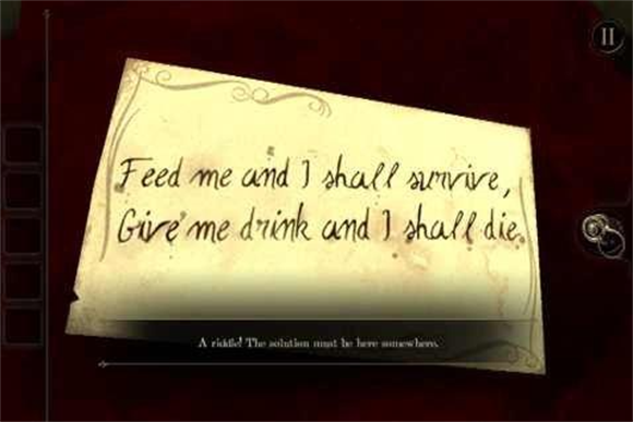 4、谜语大意是喂吃的就活,给喝的就死。箱子四只脚处有四种元素,根据谜语可以确定是火。点击FIRE,得到钥匙。