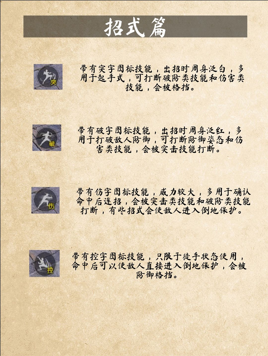 武侠乂内突击招式克制破防招式和伤害招式,破防招式克制格挡状态和伤害招式,格挡状态防御突击招式和伤害招式,控制招式无法对格挡状态起作用。