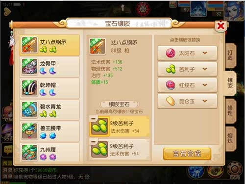 给装备镶嵌宝石可以使其变得更强力,不同部位的装备适配的宝石类型有所不同。装备等级达到30级时,就能为它镶嵌第一颗宝石;等级提升到60级,可镶嵌第二颗宝石;等级越高的装备,能够镶嵌的宝石等级也越高。