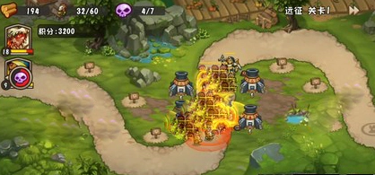 第二波:后方火炮升到三级。来了几只兽人勇士和地精医生,民兵全面崩溃,大量的怪物冲到第二部队。在怪物大量聚集的敌方使用火雨技能清场。
