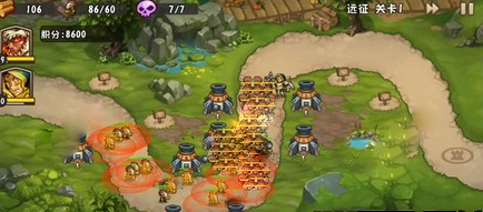 第一波:开局英雄移动到第一部队处,在第三部队处配置炮塔。这一波全是最弱的苦工,地精医生没几只,一群民兵就能守住,没什么难度。