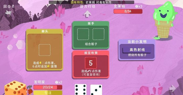 女巫这个职业,靠掷骰子攻击怪物就能推进职业生涯;火筛的伤害固定为2点,所以骰子数量越多越好。相比机器人,它是个更容易上手的职业——只要疯狂掷骰子攻击怪物就行,这样的设计玩起来也很快乐。不过核心输出全靠骰子数量,那到底怎么才能靠更多骰子赢呢?