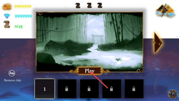 1、点击游戏界面上的【Play】按钮,即可进入游戏关卡;进入后初始拥有【9999999-金币】与【9999999-钻石】两种资源,同时需要完成【0/45-卷轴】的收集任务。