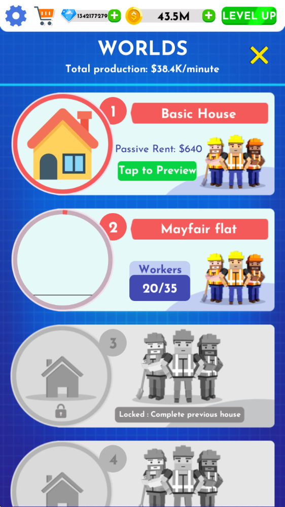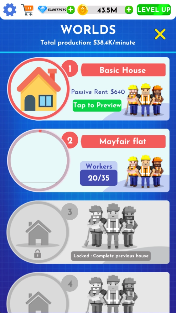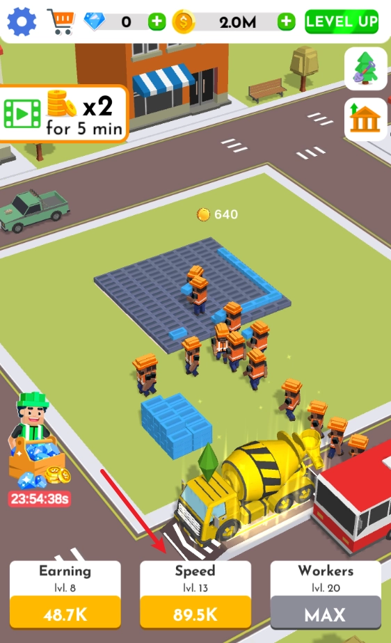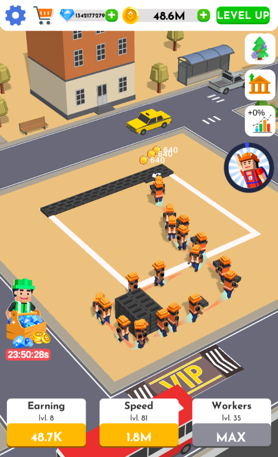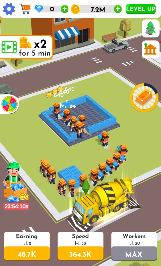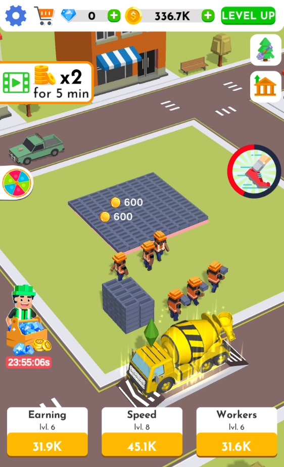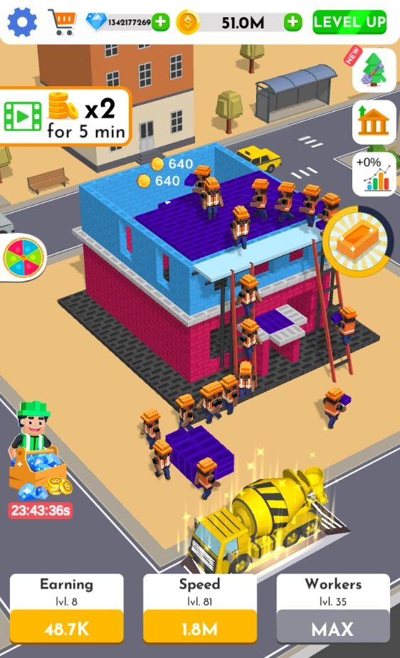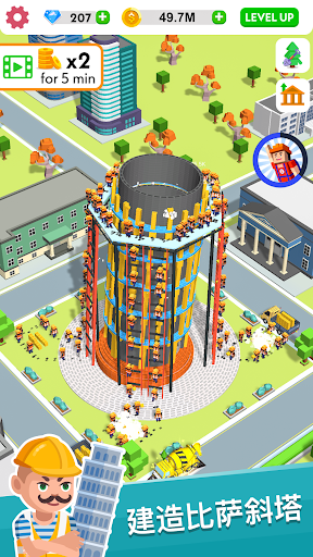 在这款游戏里,你的工人们会自动建造大楼,持续为你创造收益。你可以通过不断点击屏幕来提升工人的工作效率。另外,消耗金币还能升级公司,比如增加工人数量、提高工人速度等,从而更高效地完成建筑工程,让城市中涌现出更多你建造的标志性建筑,助你成为真正的建筑大亨!