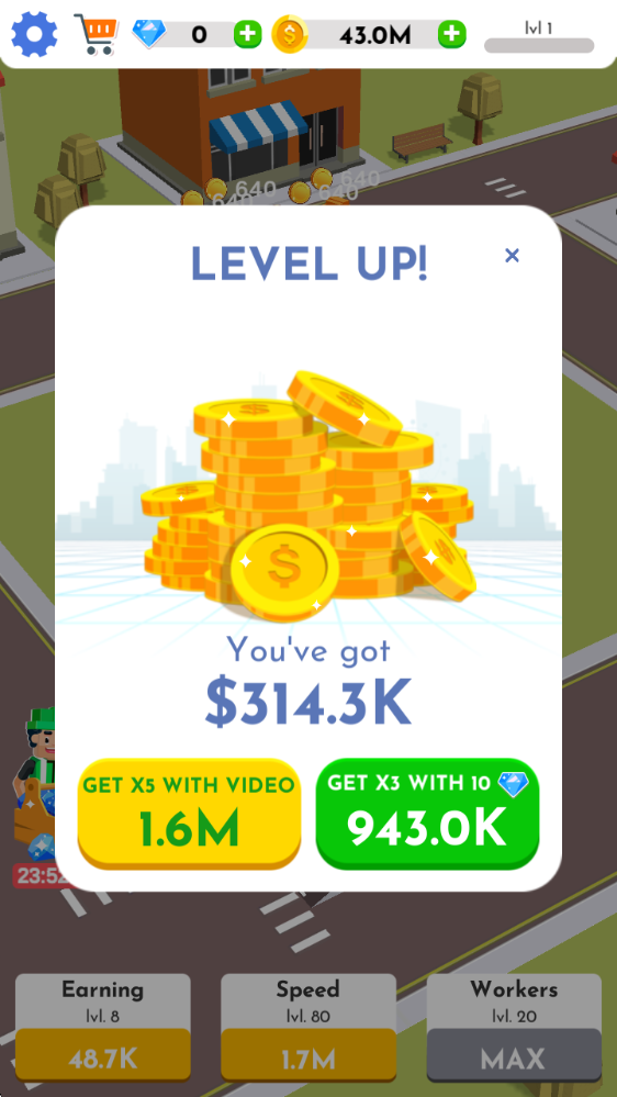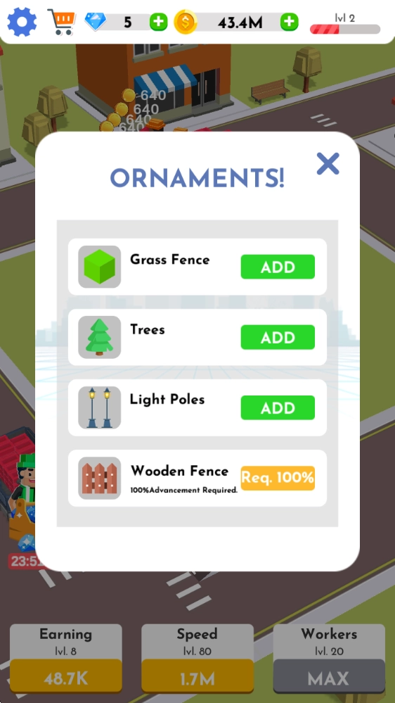 通过提升员工的工作效率与团队规模来提高建造速度,逐步获取更多专属建筑,构建属于你的商业帝国。