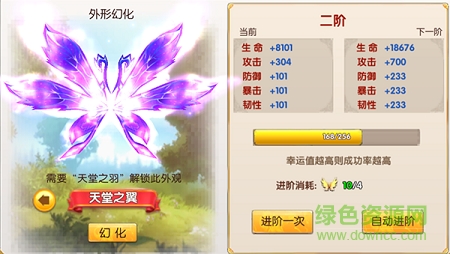 羽翼的升级需要消耗大量羽翼精华才能完成,每次点击进阶按钮进行一次操作时,都存在一定概率让羽翼直接进阶成功。不过玩家也可以选择点击自动进阶功能,当幸运值进度条填满后,羽翼就会必定进阶成功。