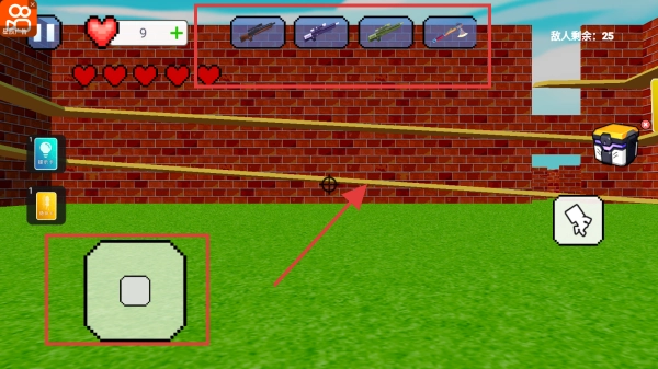 在游戏场景里,你可以通过左下角的方向控制按钮来操纵角色移动,界面上方提供了多种武器选项,你可以根据实际需求挑选合适的武器,以此来应对敌人的攻击。